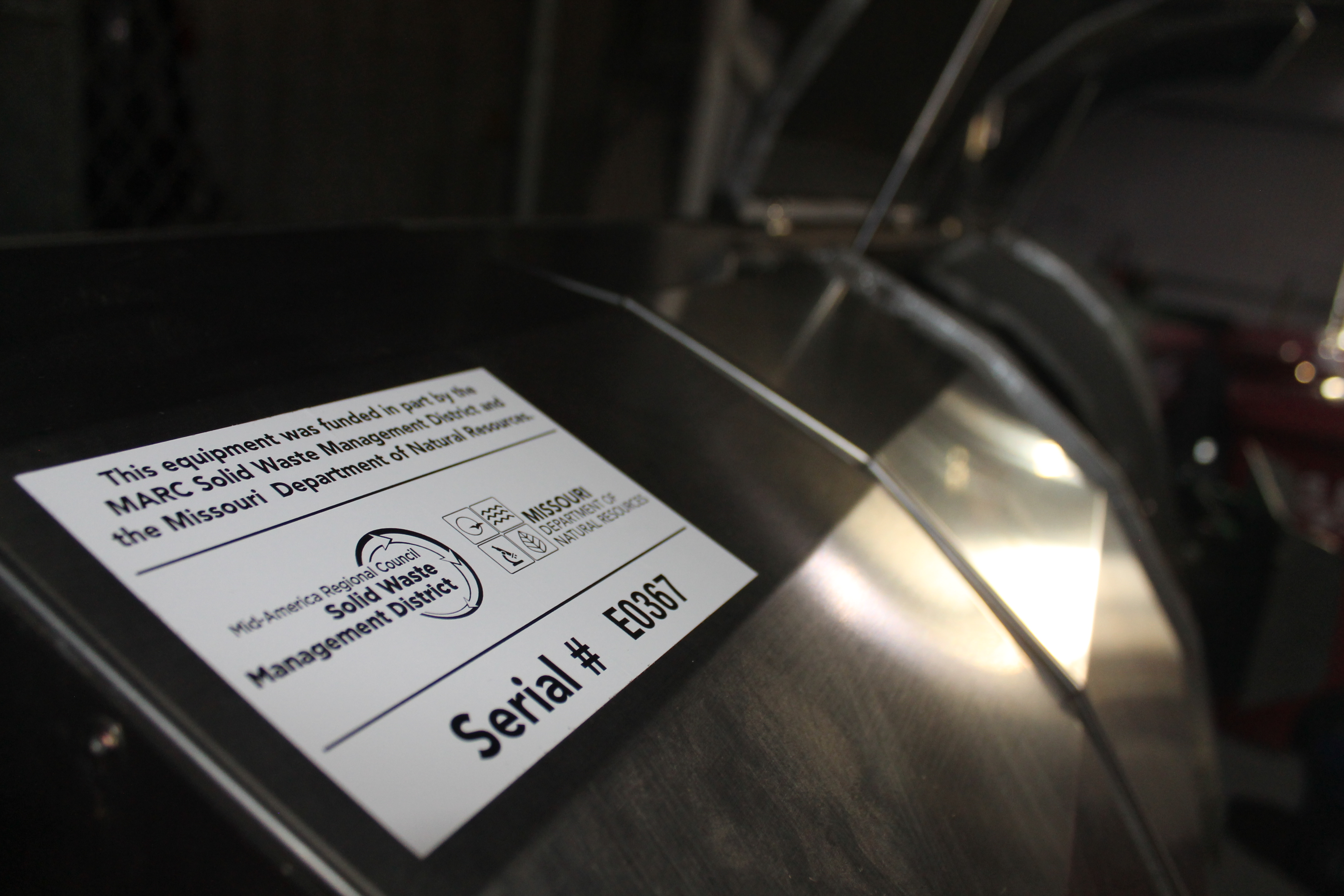 Side view of biodigester, with MARC Solid Waste Management District grant funding serial number affixed to it