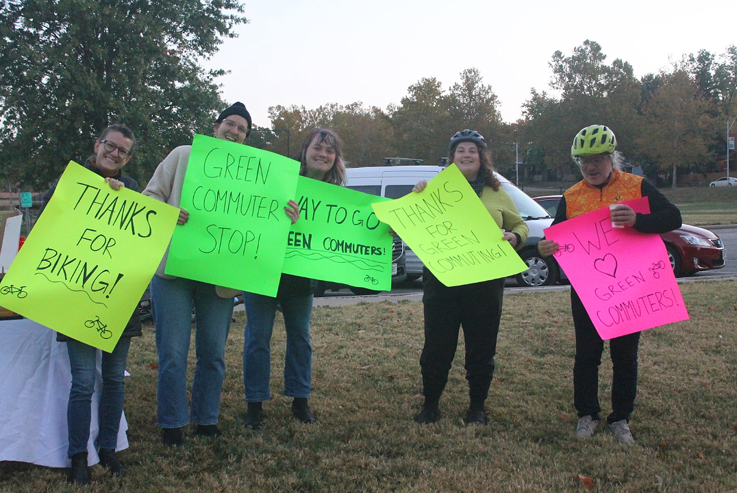 People holding signs for the Green Commuter Stop during the 2024 Green Commute Challenge.